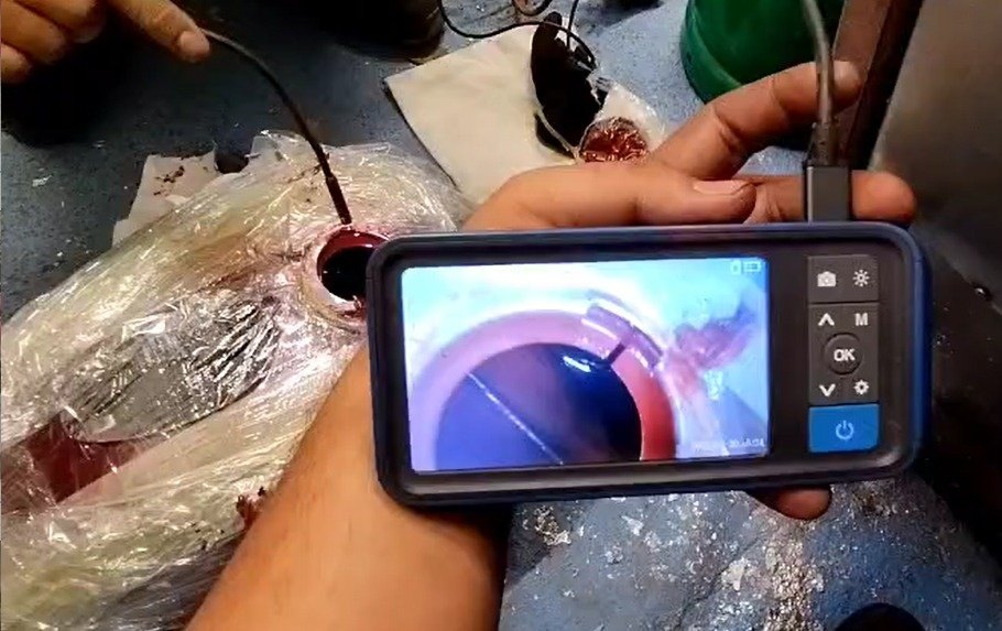 Provádíme závěrečnou kontrolu endoskopem, abychom se ujistili, že obě vrstvy barvy jsou dostatečně rozlité po celém vnitřním povrchu nádrže.